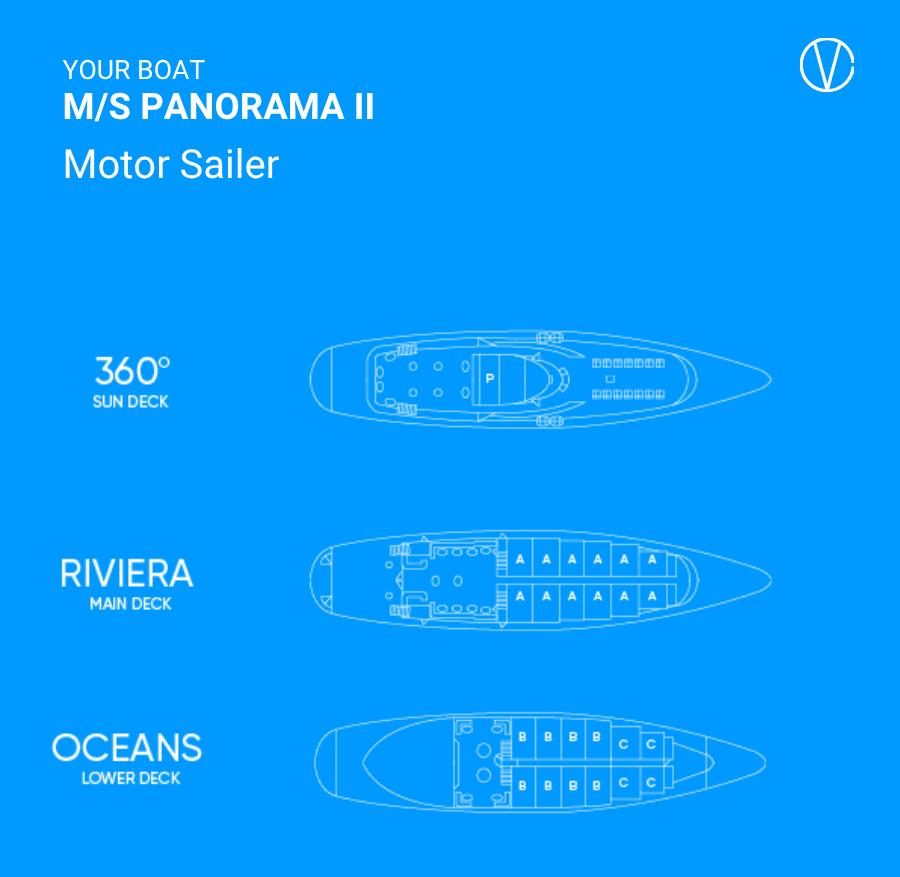 The two-mast M/S Panorama II, launched in 2004, carries just 49 passengers and offers high standard accommodation, comfort and safety. This state of the art Motorsailer has performed several Atlantic Ocean crossings, from the Seychelles to Monte Carlo and from the Black Sea to Tunis. The public areas include a main bar and lounge, which was renovated in 2015 to feature wood flooring and new furniture with soft fabrics in warm coral tones. Service on board is provided by your Captain, the Cruise Coordinator and your experienced Marine and Hotel crew members.
