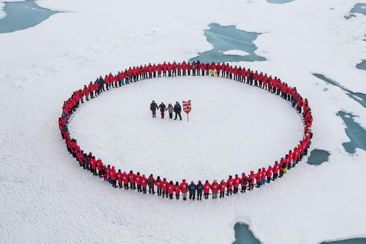 Welcome to the geographic North Pole! After carefully navigating to 90° North, we ceremoniously drop anchor on a sturdy stretch of ice, and disembark onto the frozen sea.